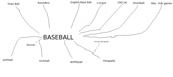 As you can see in this rudimentary chart, Baseball itself is descended from many games, and has birthed several others. Note how Kickball also is descended from soccer and Pesis draws from folk games.