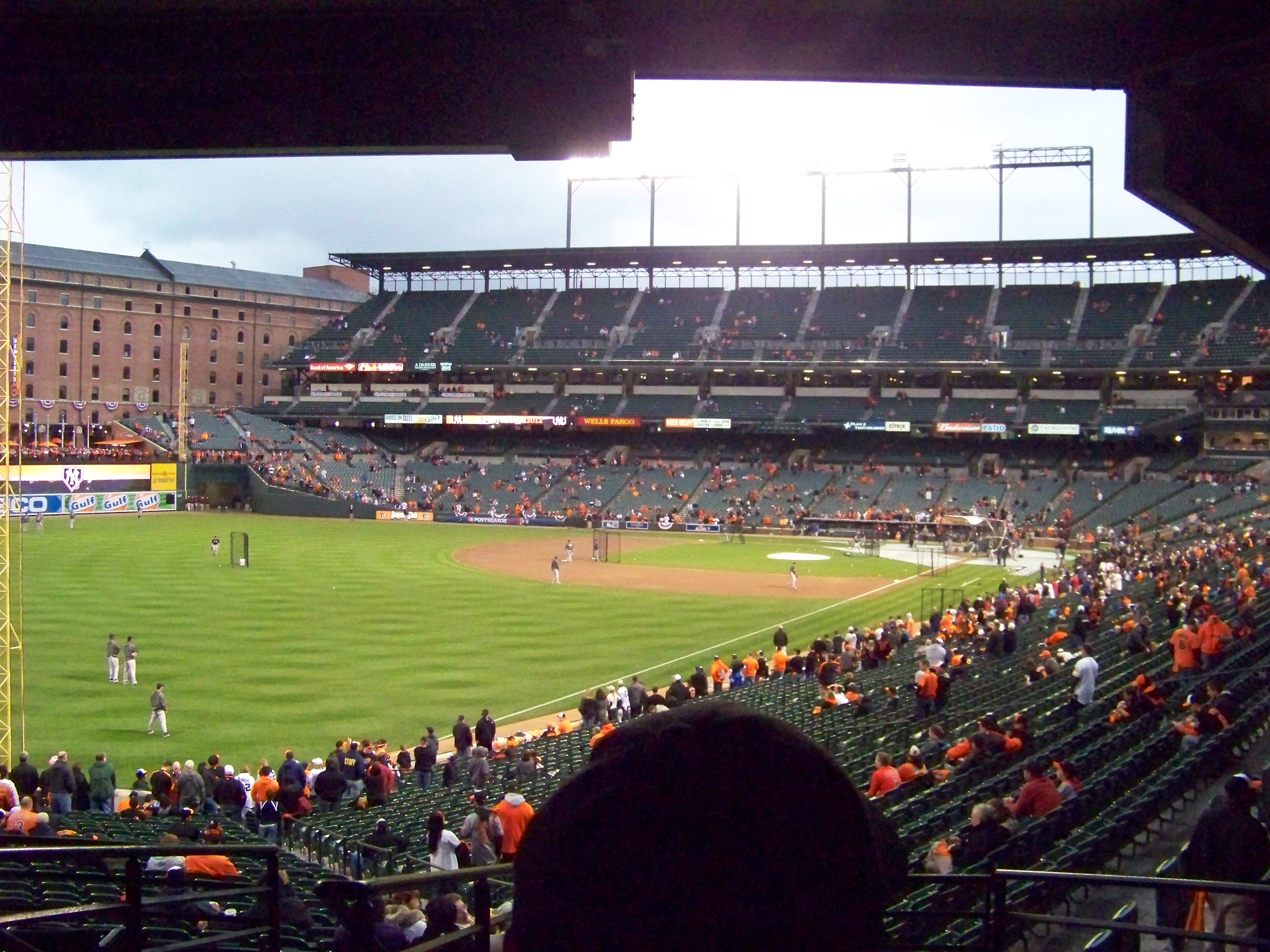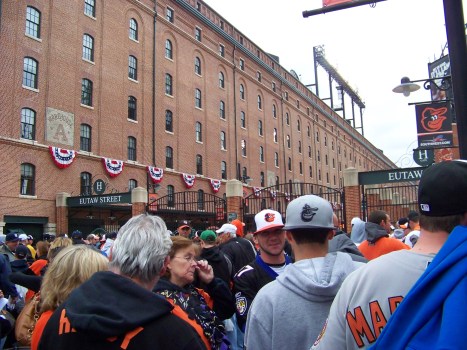 The crowds had gathered early, on both sides of Eutaw Street. Those who hadn’t come to the stadium had gone to local bars (the more of a dive, it appeared, the better). The talk in the lines were all over the place: the going-ons in the Tigers-Athletics game (the Tigers won shortly before gates opened), the start of the Nationals-Cardinals game, Fantasy Football updates, and the like. Camera were being set up, red-white-and-blue bunting had been hanged on the B&O Warehouse. Everybody was ready to go, it appeared.