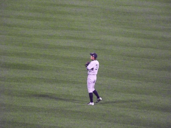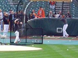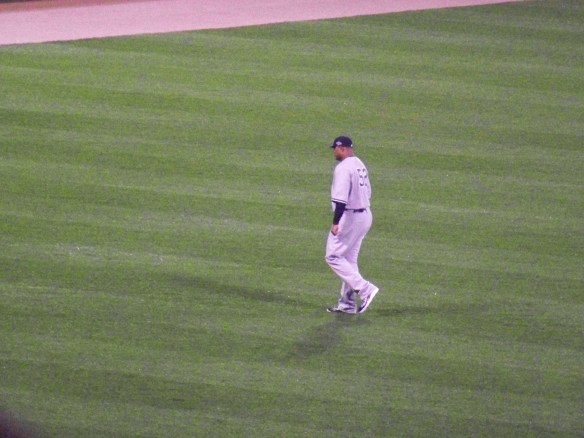 The photo above was taken from behind the bullpens in the outfield, and if you click on it you’ll see that the zoom on my camera blurred out most of the faces of the players and personnel. However, if you look closely, you can make out somebody who looks like broadcaster Michael Kay (back left, in the suit and tie), outfielder Nick Swisher (in the black warmup at the end of the first group of players), and the instantly-recognizable skinny frame of Ichiro Suzuki (back turned to the left of the cage, no doubt standing in front of several Japanese media members).