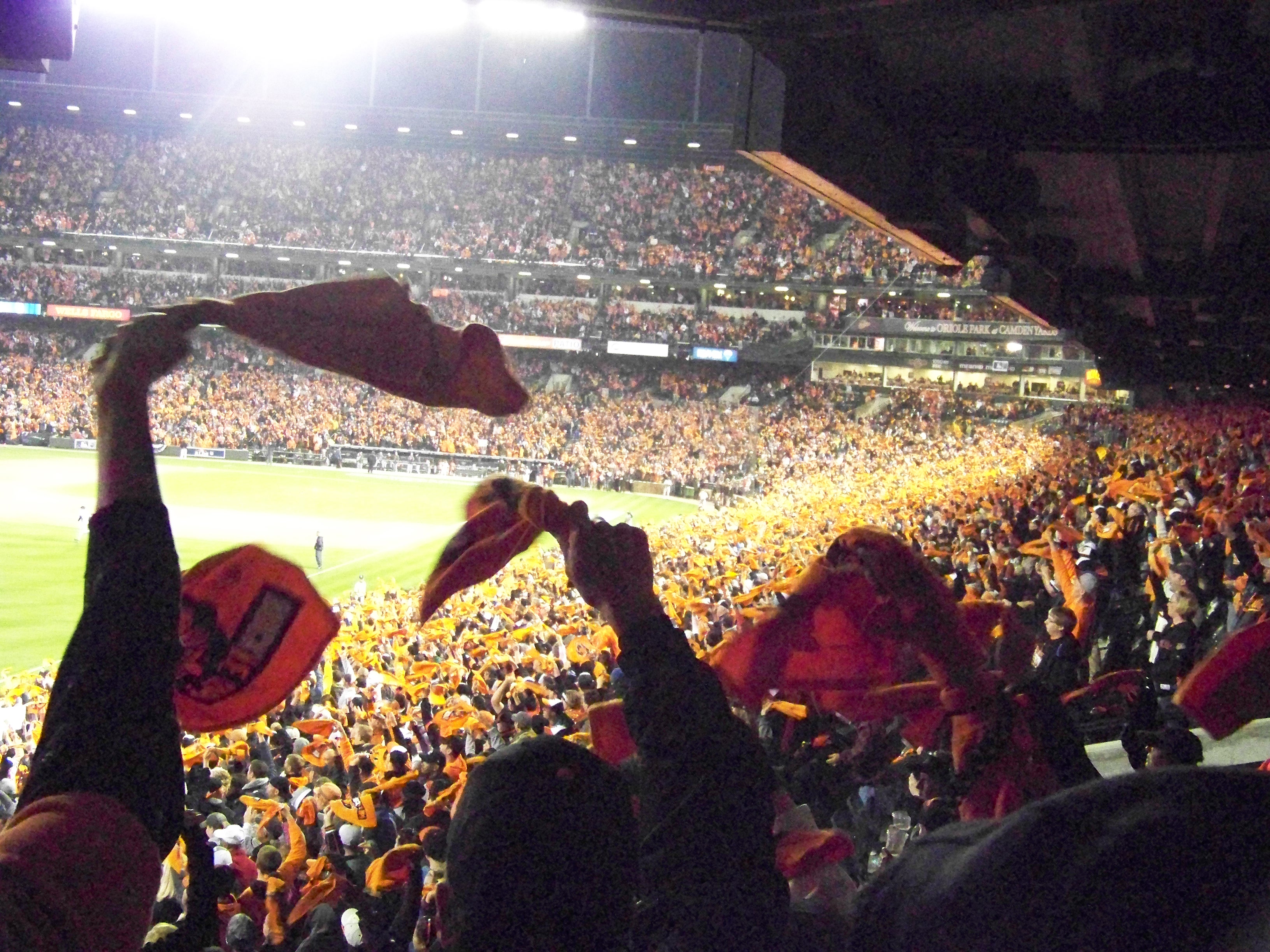 And then, the announcer told everybody that they were about to be on television, so it was time for them to go nuts. The instrumental from “Seven Nation Army” began to play, and the crowd began to chant with it, replacing the wordless beats with a cry of “OOOOO-O-O-O-OH, OOOOO-O-O-O-OHHHHHH”. And all the while, everybody was waving the orange rally towels, emblazoned with the Orioles’ marketing slogan for the postseason: “BUCKle Up!”