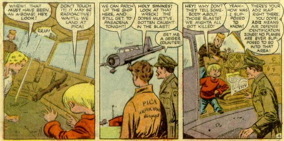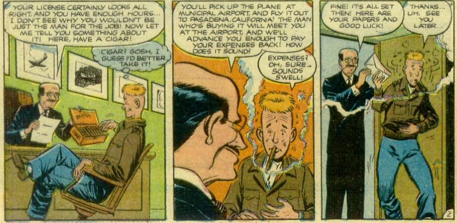 We begin (after a title page that basically previews the story), with the boys seeing a classified ad looking for a pilot.Scarecrow, it should be noted, has a pilot’s license, so off they go to Mercury Aircraft, where this exchange happens: