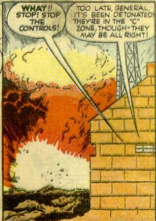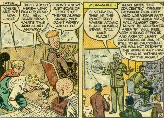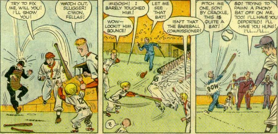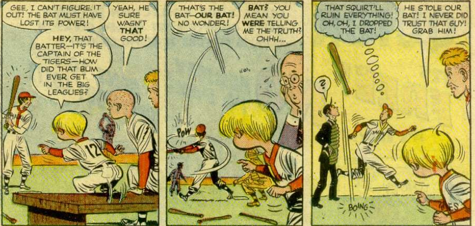 So, in short: the whole plan is messed up because not only does the head of the Tigers steal the bat, but he then sneaks into the game and then drops it, at which point the commissioner of baseball (either Happy Chandler or Ford Frick, depending on when in 1951 the story takes place- although the guy looks nothing like Chandler and only vaguely like Frick) calls the bat illegal, the Little Wise Guys are kicked out (or, rather, made bat-boys), and the bat is sent to be studied at Oak Ridge, where it was no doubt looked at by top men.