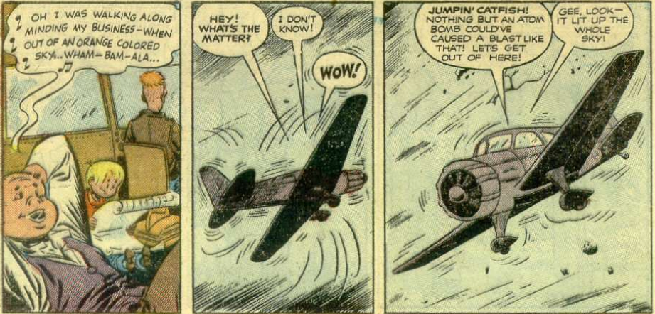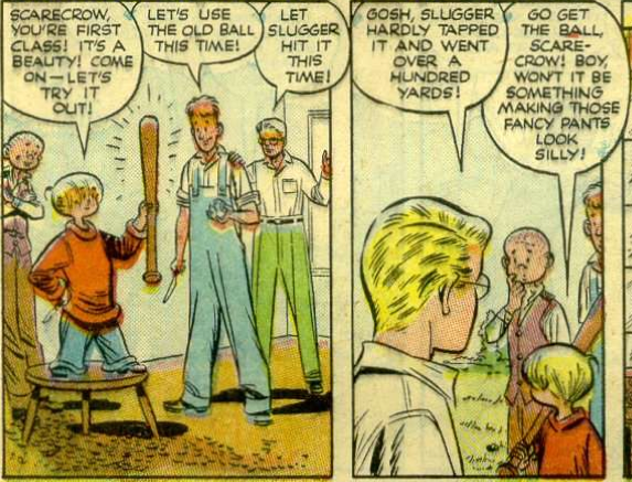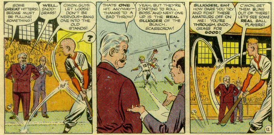 There is nothing new under the sun. That is one way to sum up the tale of “The Trick Baseball Bat” by Charles Biro (story) and Norman Maurer (art). It stars the comic sidekicks of a superhero named Daredevil (who’s name was later taken up by a Marvel character), it involves a magic bat (you know, like The Natural, only in this case it’s actually magic) and said magic bat is made out of a special type of wood that is incredibly bouncy (like Flubber in The Absent-Minded Professor). Oh, and that wood? It got it’s amazing powers from being nuked.