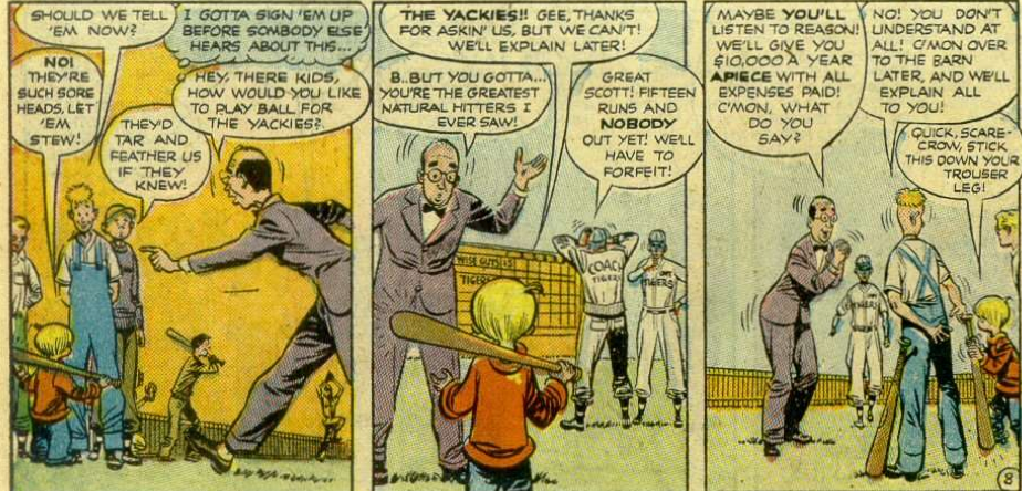 So Snodgrass heads to the neighborhood game between the Little Wise Guys and the Tigers, and that’s where he sees the mighty Wise Guys put on a show, hitting the ball everywhere and scoring 15 runs before there is even an out. The Wise Guys consider telling the Tigers about the whole thing, but then they are approached by Snodgrass, who has other ideas, leading to this sequence of events: