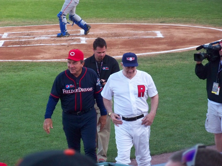100_4981 Published May 19, 2013 at 3264 × 2448 in A Day With Legends: The 2013 Pepsi Max Field of Dreams Game Johnny Bench and Altobelli leave the field after a bit of a sketch where the two of them distracted the Ripken and Easter racers for a photo op while the Altobelli racer snuck behind them for the win.