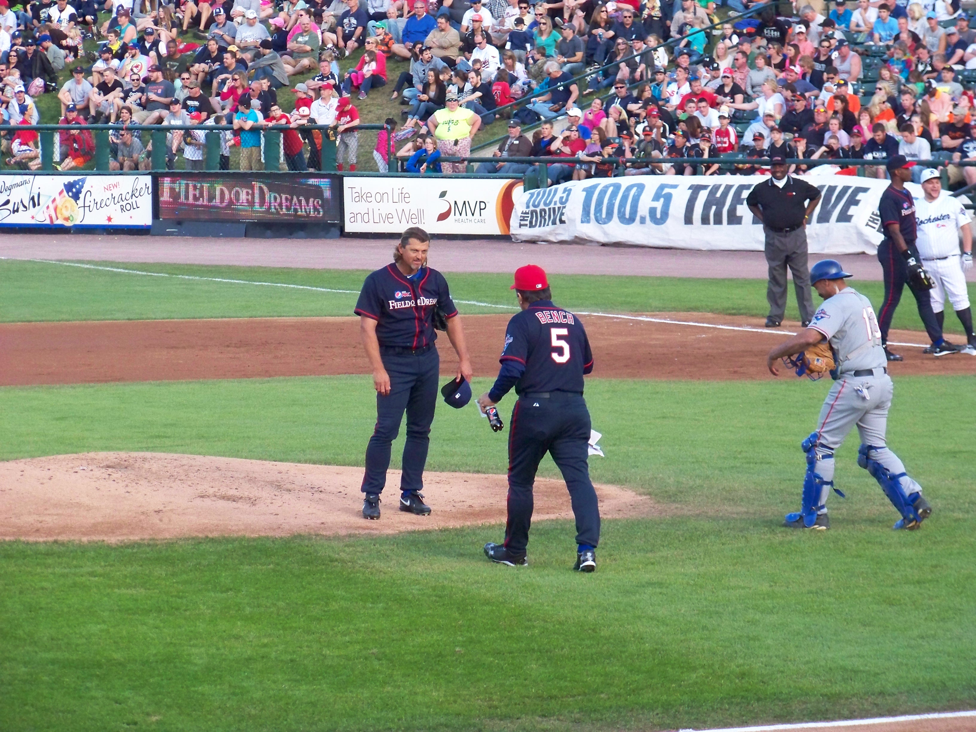 100_4983 Published May 19, 2013 at 3264 × 2448 in A Day With Legends: The 2013 Pepsi Max Field of Dreams Game At one point, while Hoffman was having trouble, Bench came out and gave him a pep-talk. It was funny.