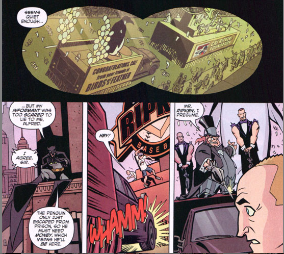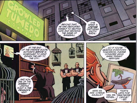Yes, the Penguin wants to kidnap Cal Ripken because he’s an Oriole. Cartoonish, but, hey, there’s only six pages or so to work with, so they got to cut to the chase.