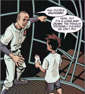 and yells at the Penguin to let him go and somehow is able to hold on while the Penguin flies away on his helicopter umbrella… thing. Batman, by the way, doesn’t stop the Penguin right here because a parade float goes out of control and he has to stop it with some sort of expanding foam. Read the comic. You’ll understand. I think. Also, allow me to just nitpick the fact that somehow the Penguin is able to fly with a helicopter-umbrella while supporting the weight of a 200 lb. man and a first grader. All that fat the Penguin seems to have is probably actually muscle.