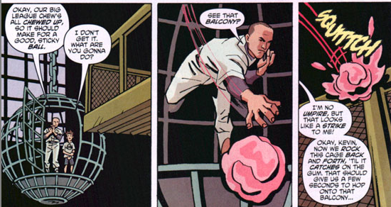 Why is this Big League Chew significant? Well, you see, Cal Ripken is a Macgyver of chewing gum. So while Batman is picking off the Penguin and his goons (I’m not posting that, because we’ve seen it before), he uses the gum to set up a way where it can be used to stick the cage to a conveniently-placed balcony. Here’s how he explains it: