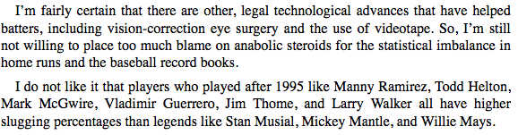 If his meaning is what I think it is though, and that he doesn’t like the 90s stars being ahead of Musial, Mantle and Mays because of all of the factors- including steroids (which, remember, he in the previous paragraph had said he didn’t put too much blame on), then he is being ignorant of the eternally changing state of sports, and sounds almost bitter about the fact that baseball has moved on at all from mid-century, as well as somewhat hypocritical, as he A) is lumping totally legal ways of improvement with illegal ways of improvement and B) neglecting that some of the records of Musial, Mantle and Mays were no doubt built partly on the fact that they had had better equipment or training than, say, players in the deadball era. That said maybe I’m reading into this too much, or misinterpreting what he’s saying.