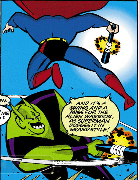 Oh, right, the Alien Overlords. Turns out they like going from planet to planet holding something called “The Nebula Cup”, in which each planet’s champion must compete against Grogg, the champion of these three-eyed green invaders. Earth wasn’t supposed to be on the list, but they got a recommendation from Lobo to come and face Superman.