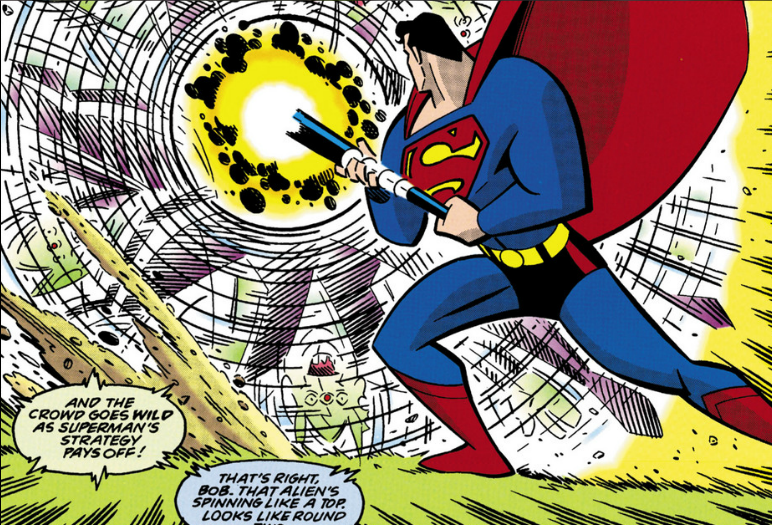 But, wait! Remember that anti-gravity bat? If only somebody could hit the neutron-star trophy with it! Except all the players have run away and Superman is already falling, so it comes down to Professor Hamilton, who despite being haunted by the memory of those schoolyard bullies is able to hit out of the park and save Metropolis!