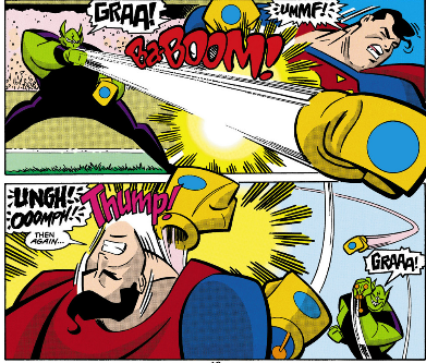 Superman, perhaps sensing that this comic is sort of getting close to an end, decides to just ditch the gloves, fly at Grogg as supersonic speed, and then start pounding the crap out of him while giving a badass speech. Seriously, read it: