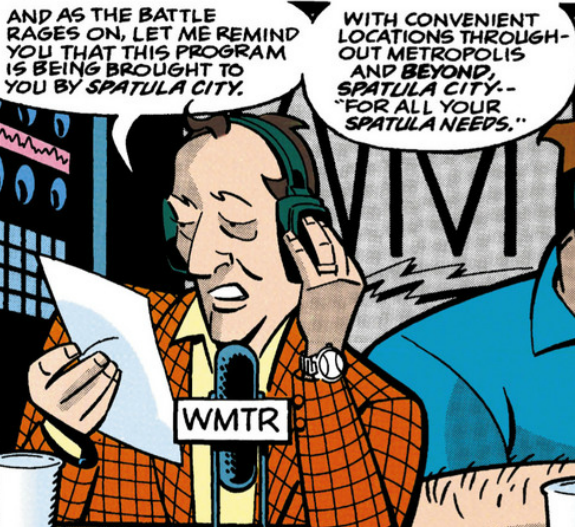 With high-tech gloves, of course. Ones that can fly and change shape and density. Not surprisingly, the fight begins badly for Superman, and by extension humanity. Also, WMTR is able to get a plug in for their sponsors too: