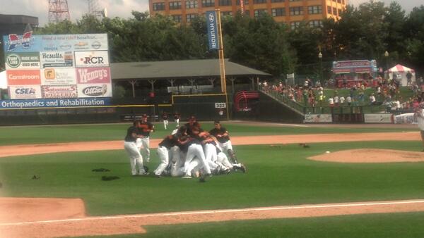 After that, it was only a matter of time. Scranton put in catcher Ryan Baker to finish the last few innings, and amazingly his ridiculously slow knuckleball (at one point it got as low as 38 MPH) was enough to hold the Wings to just one run (a Eric Fryer homer in the 8th). Virgil Vasquez pitched the final two innings for the Wings (Diamond threw 7 innings and gave up 7 hits and 3 ER before being pulled), and in the end, it was Ray Olmedo who caught the pop-up in foul territory that finished the game and brought about a grand celebration on the field.