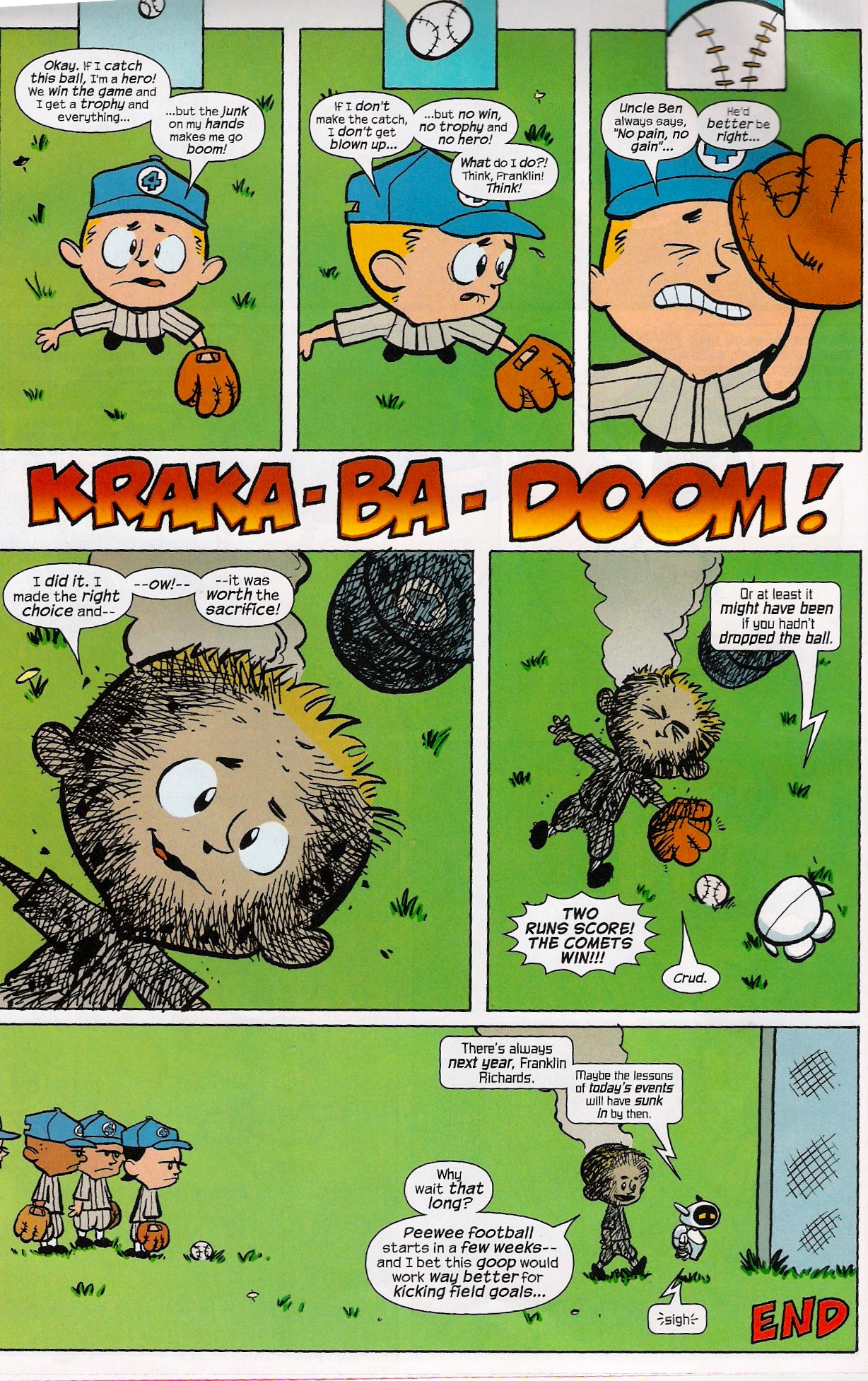 And, in 2006’s Franklin Richards: Son of a Genius Super Summer Spectacular, there was a short comic about Franklin playing baseball, entitled “Field of Screams” and done in tribute to Charles “Peanuts” Schultz.