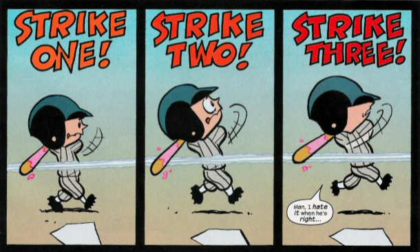 Anyway, you can probably guess how the rest of this comic (which has about… a page and a line left in it) goes: Dick comes up in the 9th inning despite still being dizzy and socks a walk-off homer….