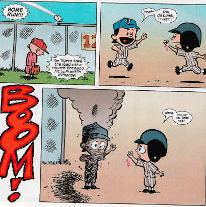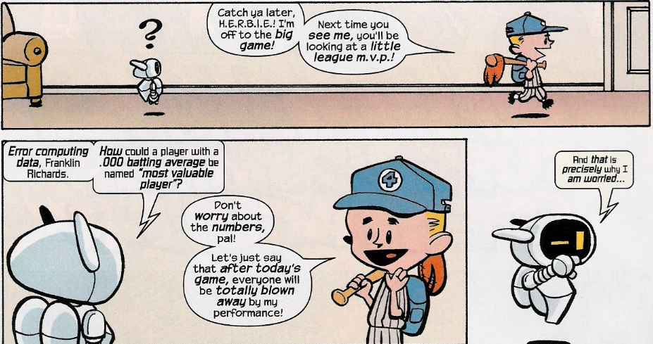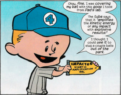 So, just before the game (where we see Mr. Fantastic using his stretching powers to create a “We’re number one” finger), Franklin starts rubbing some sort of goo upon his bat. Not surprisingly, this is what his plan is, as he helpfully explains when HERBIE accosts him for this: