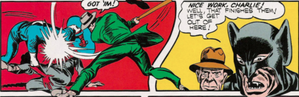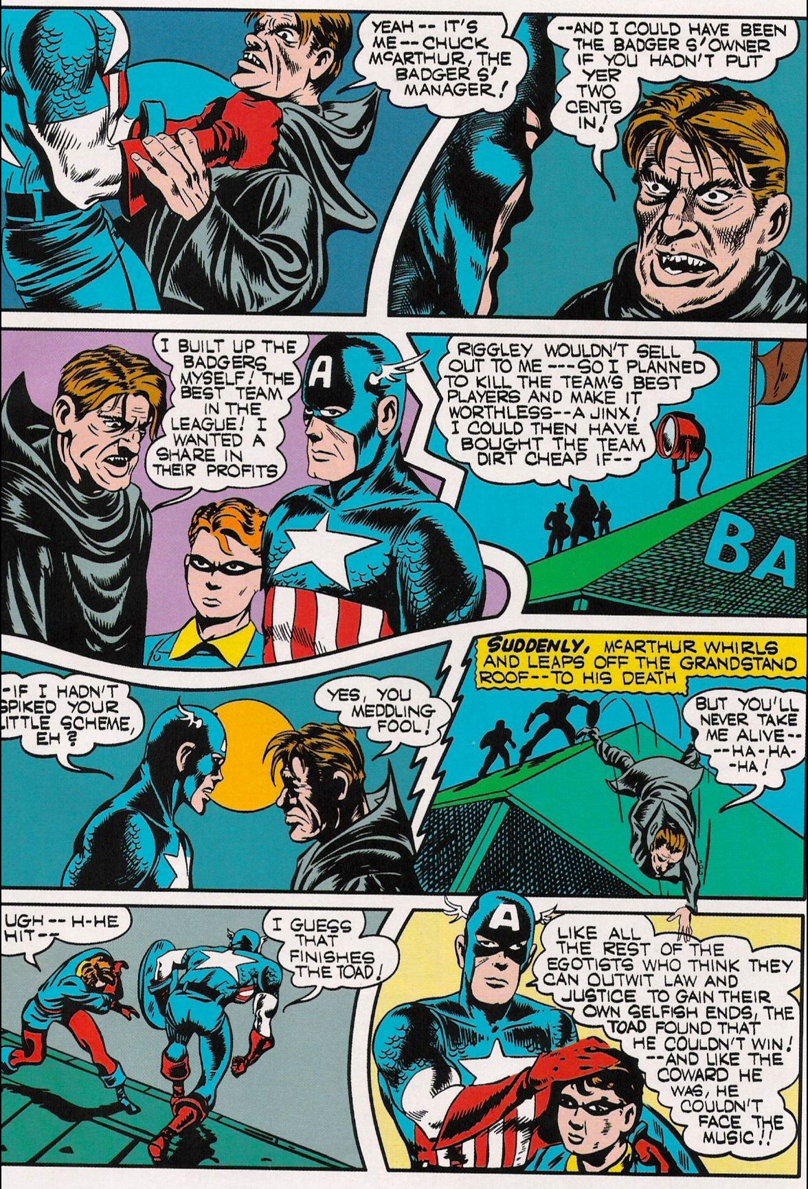 The Toad then jumps out and tries to get away from Cap and Bucky by running into the Badgers’ dugout. After a big fight (which sees Riggley die of a heart attack or something), and it’s time to see who is behind the mask. It’s the creepy trainer, right? Right?