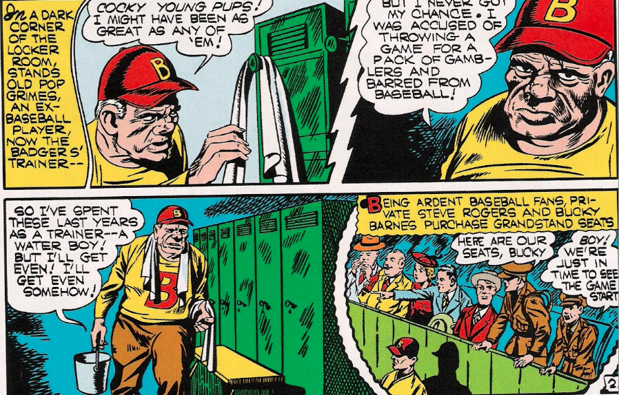 And so, Cap and Bucky jump into action, quickly finding the Black Toad in a little hideaway near the dugout…. at which point America’s finest Super-soldier and his sidekick get their asses kicked by dudes with baseball bats: