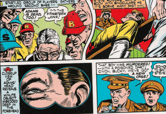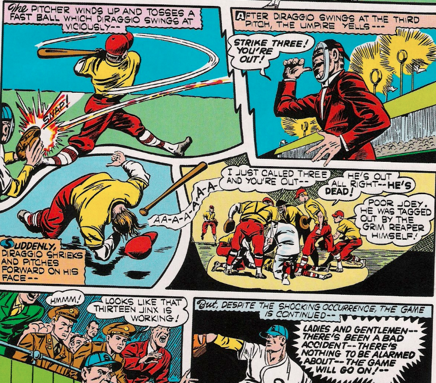 This, by the way, is the second time a Joe DiMaggio stand-in has been murdered in a Bizarre Baseball Culture. Interestingly, that also was in a comic involving a patriotic superhero.