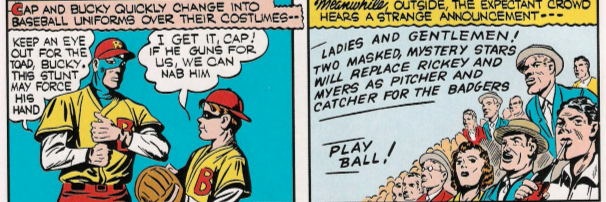 Anyway, the next day, as the best remaining player for the Badgers refuses to take the mound, Cap and Bucky show up and, of course, offer to play. And, of course, the offer is accepted, despite the fact that the Badgers- and the league office- have no idea what these people’s real names are or how old they are or… anything else besides the fact that they are Captain America and Bucky. Oh, and one would think there’d be a problem with a super-serumed pillar of the peak of human ability playing, too. But, hey, nobody cared about steroids back in the 40s.