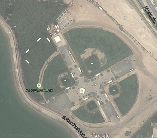 At Al Quoz Pond Park south of Dubai’s downtown is the site of the Dubai Little League. To be more specific, the picture of the game with the Burj in the distance was taken at the large, adult-sized north field. As you can see below, this Little League facility is definitely close enough and in the right direction relative to Dubai’s downtown where the view in the top picture is what batters would see: