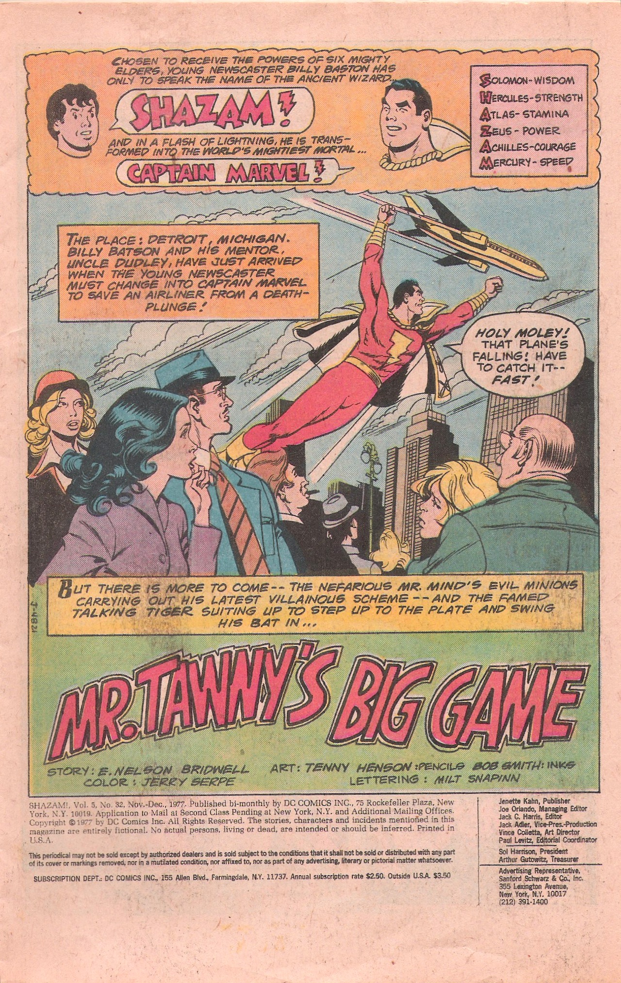 So, here’s Shazam! number 32, from late 1977. I covered most of Captain Marvel’s complicated history (and why most people think he’s called Shazam) way back in May 2012, so if you want to know that, go there. However, an update is in order: DC has more or less given up calling him “Captain Marvel” and now is referring to him as “Shazam”. This is partly because everyone who doesn’t read comic books calls him that anyway, and also partly because Marvel has recently given the title of “Captain Marvel” to a character named Carol Danvers (who appeared as “Ms. Marvel” back in one of the AAA baseball comics) to great success, to the point where it’s thought they might make a movie starring her, likely with the name “Captain Marvel”.