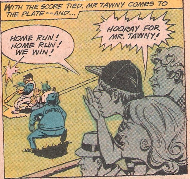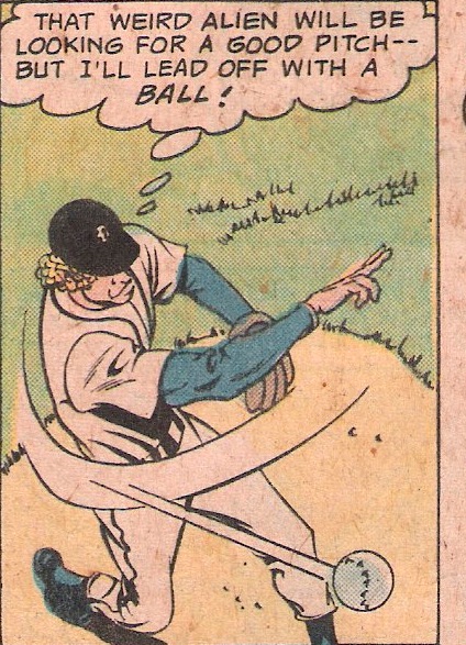 I have to say, seeing as how the story’s writer, E. Nelson Bridwell, is noted on Wikipedia as being a “Continuity Cop”, that I am disappointed at the lack of the Martians from that 1943 comic. Oh well. Also, I’m pretty sure some of the things the aliens do in this comic are against baseball rules, but, well, this is a comic featuring a talking tiger and a kid who becomes a superhero by saying a magic word, so maybe I should be quiet.