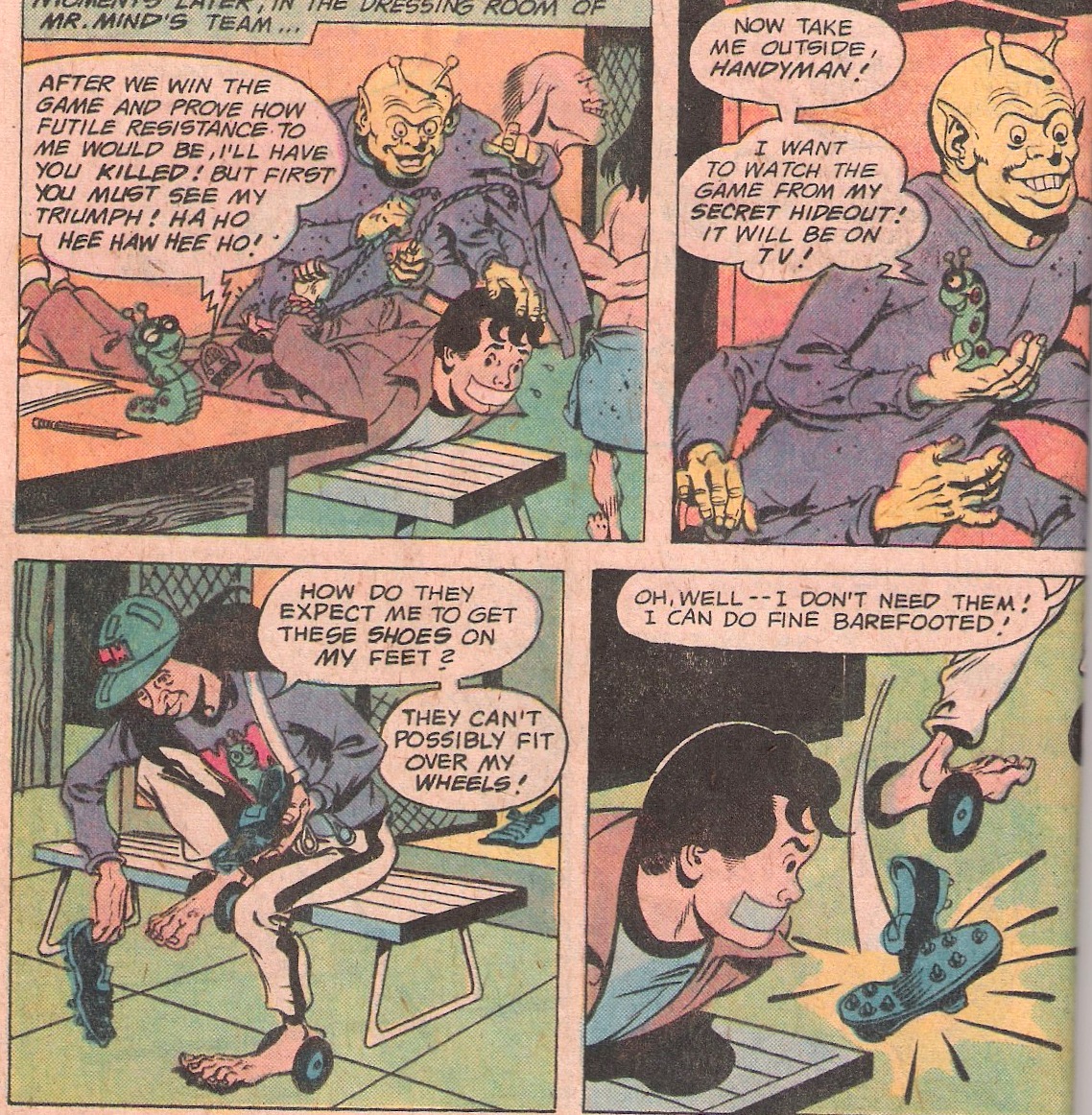 Anyway, Captain Marvel is having one of this, and soon has gotten a spot on the team. Mr. Mind is having none of it, however, so, while Billy Batson takes a break to call in the news about how Captain Marvel is going to have a game against aliens, Mr. Mind’s all-stars kidnap him. Thankfully, one of the aliens doesn’t want to use cleats, thus providing us a possible get-out-of-jail device… eventually.