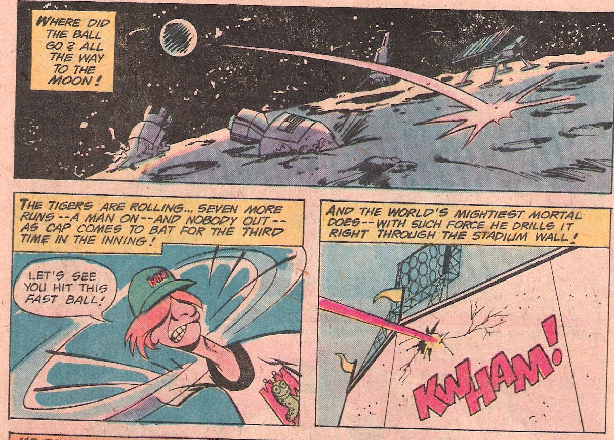 Oh, and then, immediately after the game, Captain Marvel arrives and saves the New York Yankees from getting executed by the aliens. Amongst the Yankees, by the way, is the unmistakable profile of George Steinbrenner: