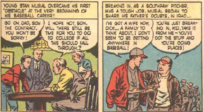 We begin with him joining the Cardinals organization (despite his father’s objections), where he was initially a pitcher. After troubles, he is considering whether he is made for professional baseball. This is, like, in the first two panels. Compare to how in the Ripken bio-comic there were a few pages of him as a youth. That’s the difference between an entire comic and one six-page story.
