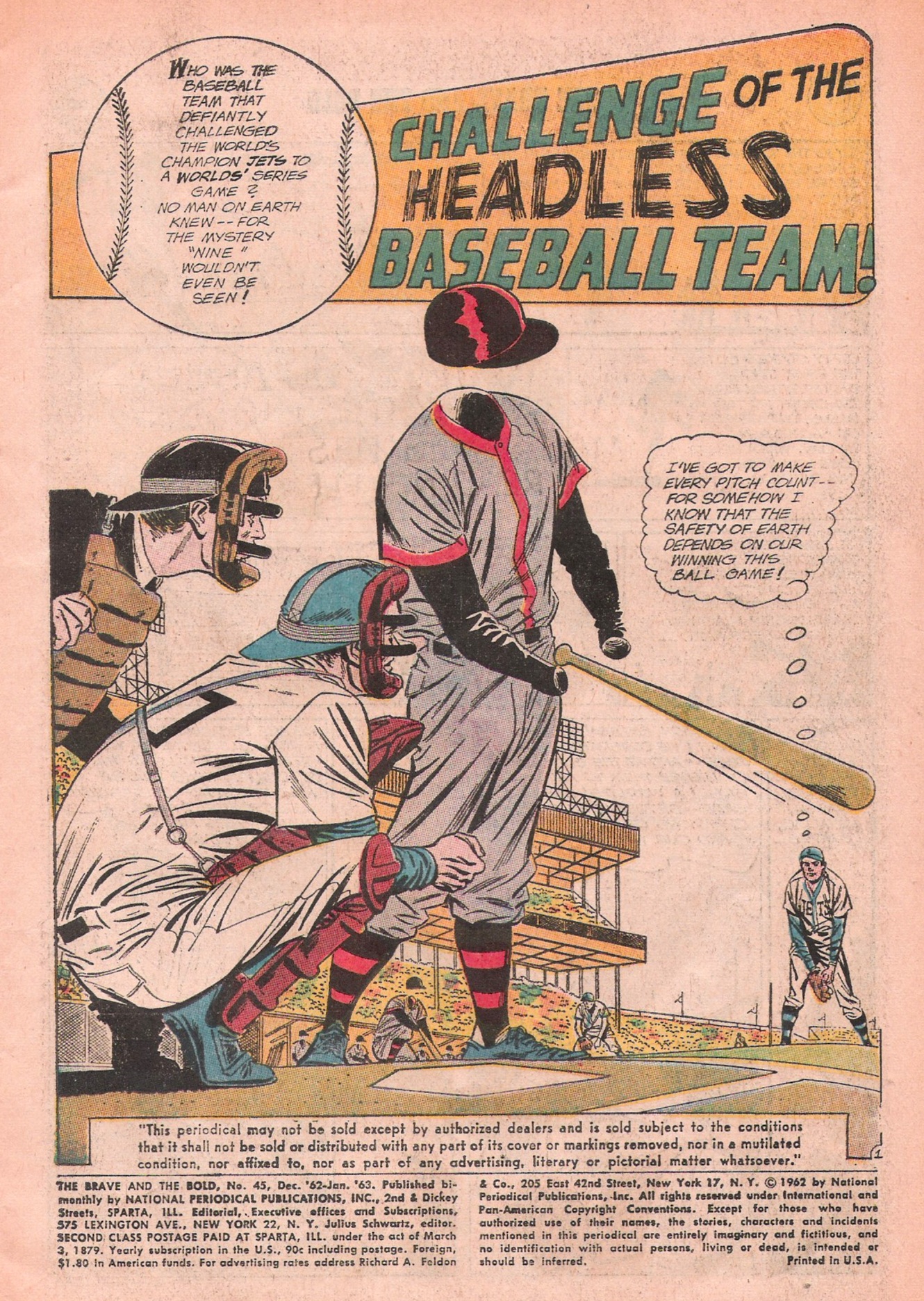 And we’ll begin with the very first “Strange Sports Stories” story, from waaaay back in December 1962 or January 1963 (it’s cover date was January, but comics often come out before the cover date, so it likely was already out in December- if not even earlier, as the GCD says it was on stands in late October), in The Brave and The Bold #45, the first “Strange Sports Stories” installment ever: “CHALLENGE OF THE HEADLESS BASEBALL TEAM!”