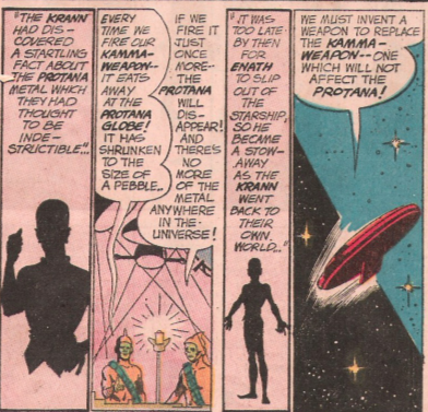 Above is just the first page in which we see the adventures of Enath of Kalomoor. Basically, his folks have been getting attacked by the Krann warriors, who have Kamma-Rays and a metal called Protana, which make them unstoppable. Enath, however, discovers something startling about the Protana and the Kamma (“Protana and the Kamma”, of course, would make a great name for some sort of female hippie space-age band): the Krann are going to run out of Protana if they keep shooting the Kamma, so they need to come up with a more protana-efficient death ray!