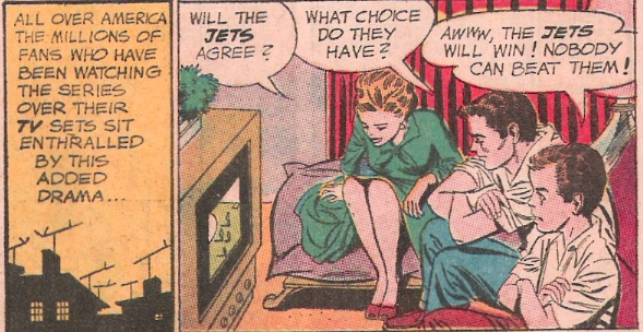 1. The champion… New York Jets. Now, this came out in 1962/early 1963, so it was still before the NFL team was playing under that name (they were originally the Titans until the 1963 season). However, the Mets were playing by now, and it’s almost certain that Fox meant the “Jets” to be a stand-in for the Mets. So, after one of the worst seasons in the history of professional sports, the New York Mets got to be used in-disguise as world champions in a comic book. Yeah?