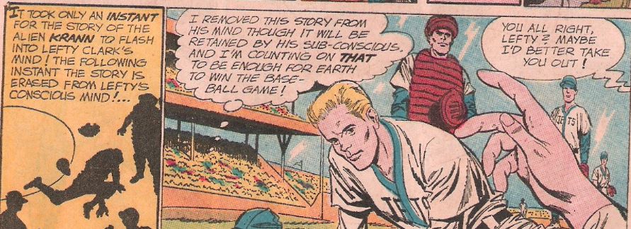 Now, after this splash page, we go back to the beginning of this strange trip: earlier in the day, during the final game of the “World’s Series”. Yes, the “World’s Series”. Now, occasionally the “World Series” has been referred to as the “World’s Series”, but I’m guessing this is more just DC’s way of not having to worry about confusion or copyright or anything like that. We see the Jets win the series thanks to some clutch pitching from “Lefty Clark”, who strikes out the side with the bases loaded to win it.