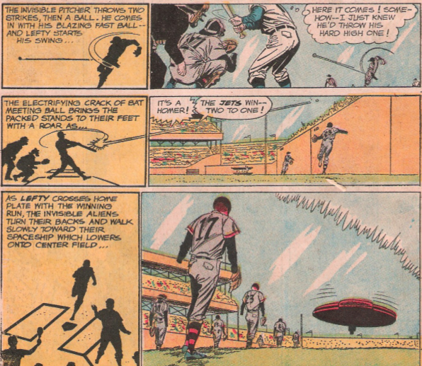 Anyway, the Jets agree (as if they have any choice), and the challengers from outer space take the field. As you know if you’ve looked at the cover or the first page of this story, they are invisible men- their uniforms visible, but their bodies not. The skipper of the Jets, having now seen his opponent, decides to stick with Lefty Clark, since he only pitched one inning in the first game. Man, I bet he didn’t expect to play a doubleheader when he woke up in the morning, huh?
