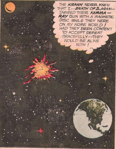 The Krann take the loss poorly, fly into space, prepare to death-ray Earth into dust but then are punished for their poor sportsmanship by blowing themselves up because Enath had plugged up their weapon with a magnetic disc earlier in the story (I told you that panel would be important!).