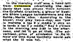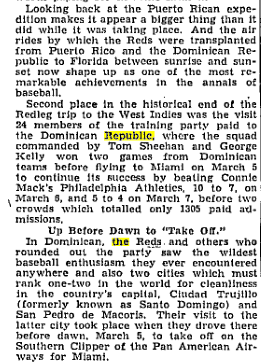 While baseball had been played long before then, it’s popularity exploded in the Dominican in the 1930s as General Rafael Trujillo encouraged the many sugar refineries there to form teams. And it is in the 1930s when we see the first Sporting News reference to the Dominican Republic, in a March 12, 1936 story on jaunt by the Reds to the Caribbean during spring training: