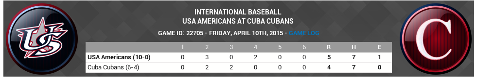 A match-up between Yosvani Torres and Max Scherzer, the Americans drew first blood in the 2nd inning on a 3-run shot by Jonathan Lucroy, who was likely only playing because of Buster Posey’s injury. The Cubans got 2 of those runs back in the bottom of the inning, however, on a Hector Olivera double.