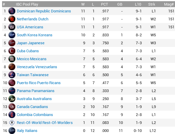 The third series of the years would begin today: Puerto Rico at Australia, Panama at Taiwan, Venezuela at Italy, Japan at the Dominican (a face-off of undefeateds), Canada at the Netherlands (the Dutch would be the last team to have their home opener), the Rest-Of-World team at USA, South Korea at Colombia, and Cuba at Mexico.
