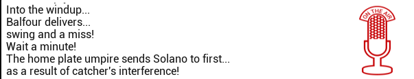 “Well, ain’t that a ripper? Still, we’re seeing a replay now up here in the booth, and it is definitely a case of catcher’s interference by Allan De San Miguel. Nothing to whinge about, I guess. I wouldn’t want to be him after the game if this turns into a dinkum of a mess. He’ll probably hear some of Grant’s fine poetry. Words like !@#$, !@#$, and maybe Mother!@#$er. Truly, a man after my own !@#$ing heart. Wait, what’s that? Oh, yes, sorry to all children listening to the game, again.”