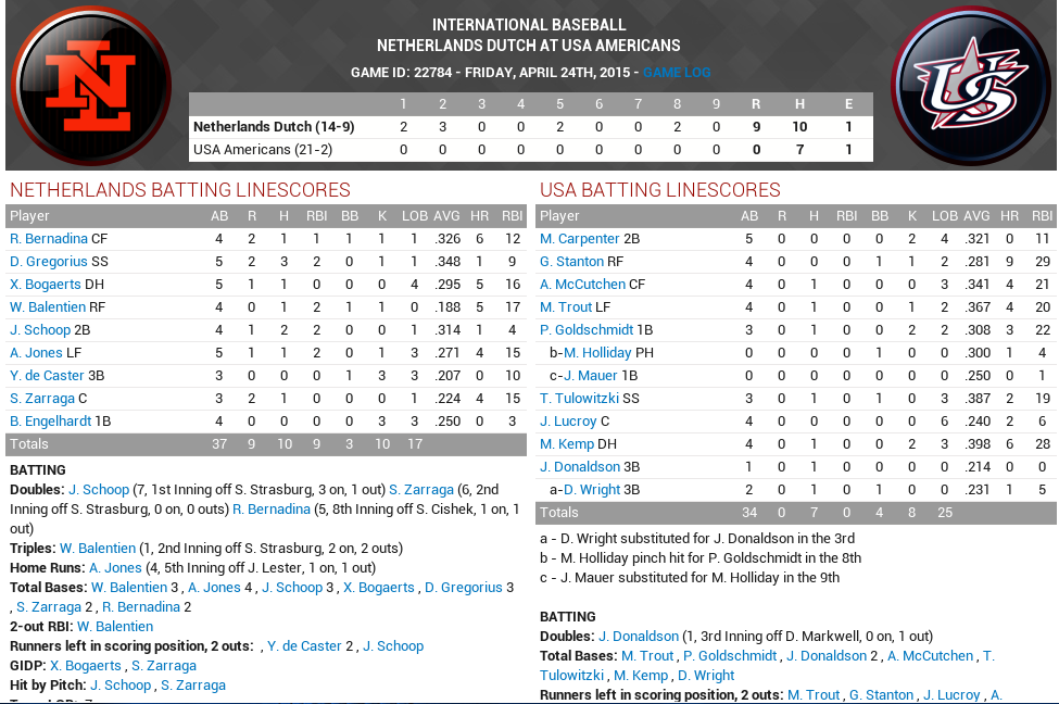 In Boston, Joe Maddon was glad to see that perhaps Babe Ruth had not put a spell onto the USA bats, as they went nuts on the Dutch pitching for a 13-0 win, including Mike Trout’s 5th HR. Matt Harvey went 6.2 IP, giving up 4 hits and striking out 12.