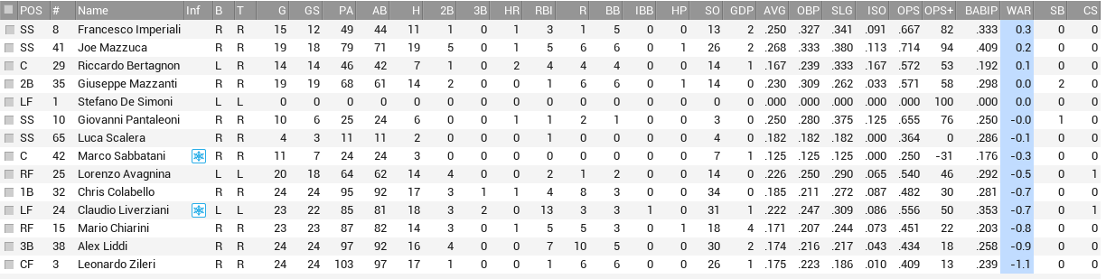 Last in the league but first in our hearts, Team Italy is far less capable than it’s real-world WBC counterpart due to the fact that they lack American players of Italian descent- they only have players either actually born in Italy (such as Alex Liddi) or who spent significant amounts of time there (such as Chris Colabello, who spent parts of his youth there). So let’s take a look at the Italians: