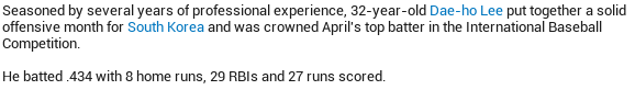 South Korea beat the Netherlands- who now fell below .500- 8-2. Dae-Ho Lee, Jung-Ho Kang and Keun-Woo Jung all homered for Korea.