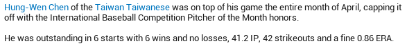 While Hung-Wen Chen of Taiwan won Pitcher of the Month: