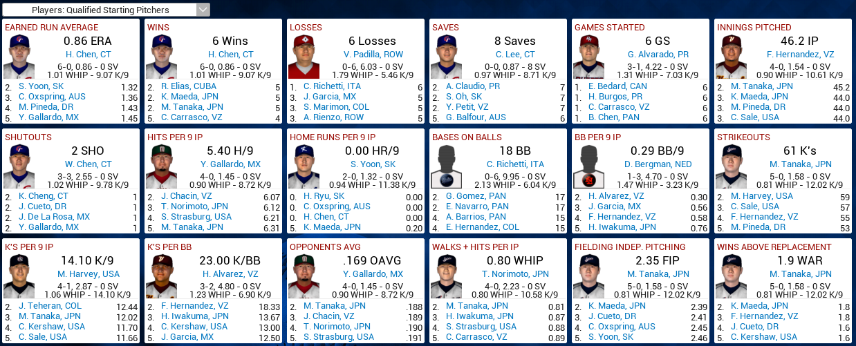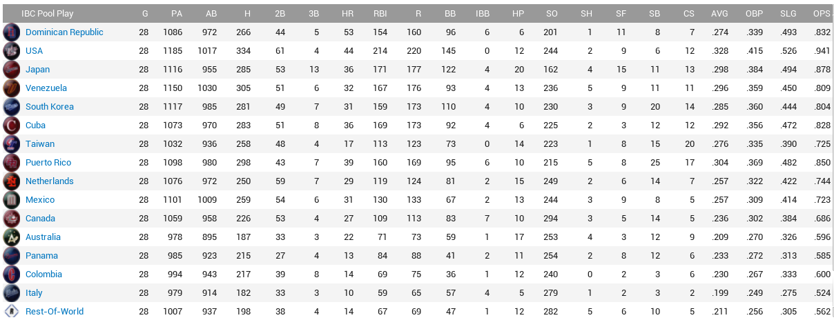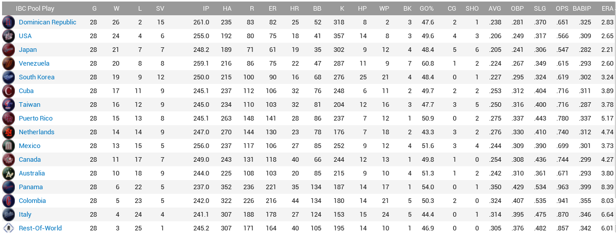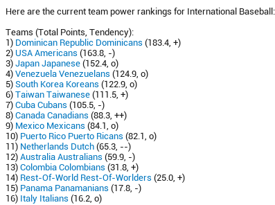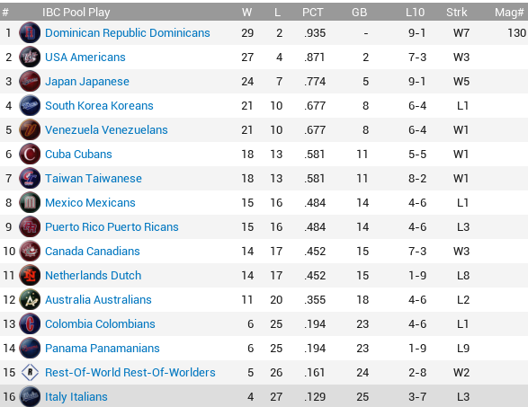 The last day of the week, and the first day of new series. The Koreans regained Yong-Taek Park from the DL, and the new series prepared to begin: Korea at Taiwan, Mexico at Japan, Australia at Cuba, Netherlands at Venezuela, USA at Puerto Rico, Italy at Rest-Of-World, Dominican at Panama and Colombia at Canada.