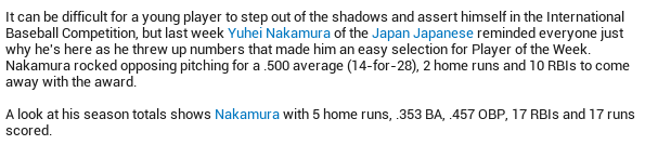 Japan beat Cuba 6-3 in Havana, as Seiichi Uchikawa went 2-5 with a triple and a homer, racking up 4 RBIs. Yoshio Itoi also homered, while Masahiro Tanaka went 8 innings.