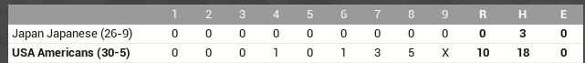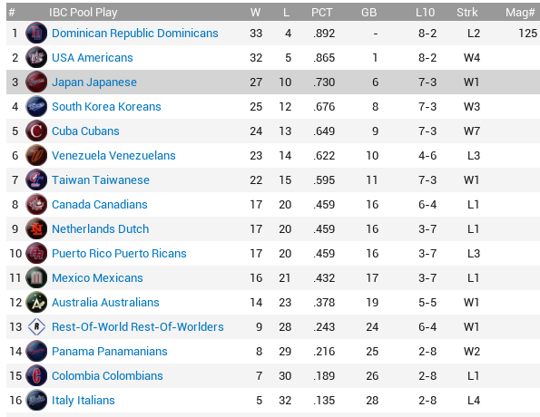 Meanwhile the new round of series began: Panama at Australia, Venezuela at Korea, Puerto Rico at Netherlands, Cuba at Italy, Rest-Of-World at Colombia, Japan at USA, Dominican at Mexico and Taiwan at Canada.