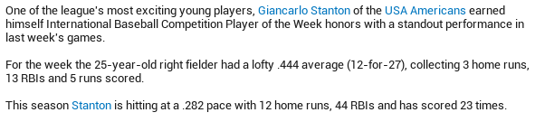 And, in Boston, Team USA won a back-and-forth game with Japan, 8-7, mainly because of an excellent performance by Giancarlo Stanton, who homered and tripled, racking up 5 RBIs on the game. Interestingly, though, Craig Kimbrel finally showed humanity, giving up an earned run- his first of the year- in the 9th to a single from Seiichi Uchikawa. His ERA now stood at… 0.53.